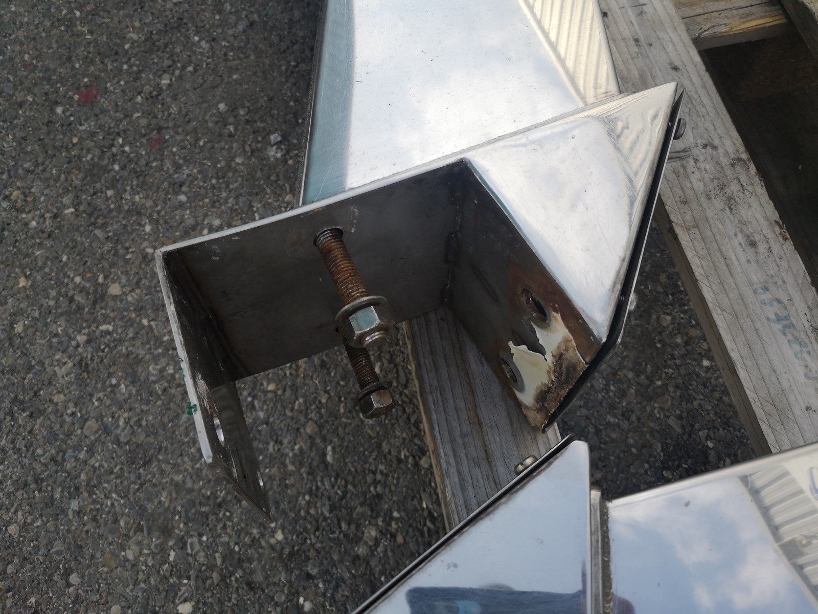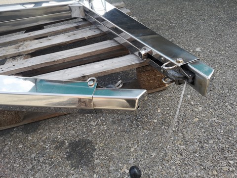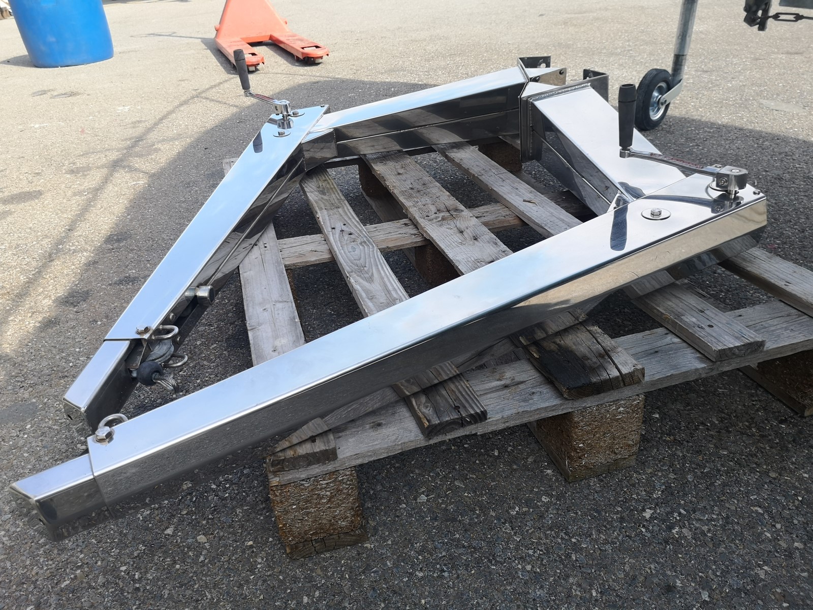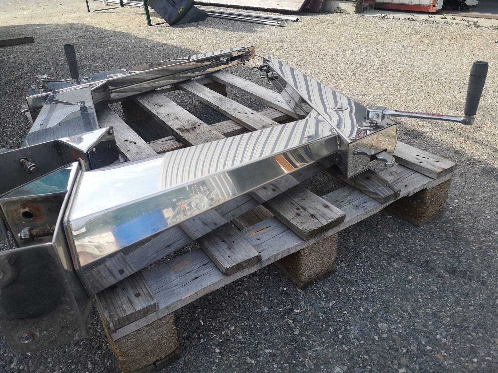 Bossoirs inox avec treuils pour bateaux 10/15 métres, l'adaptateur se retire pour avoir une base plate de 190x135mm, état neuf.hauteur 660mmlongueur 1100mmlargeur bas 135mm haut 85mm