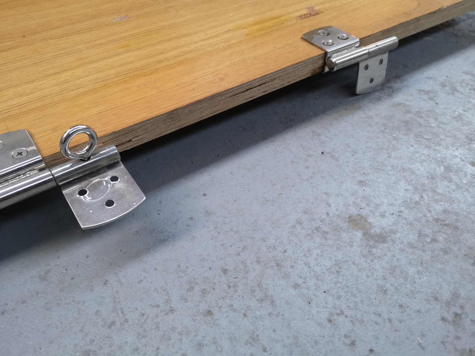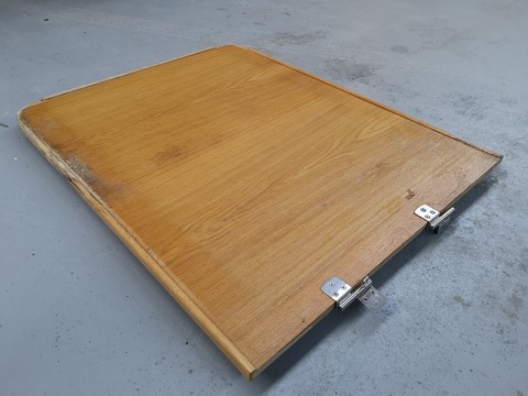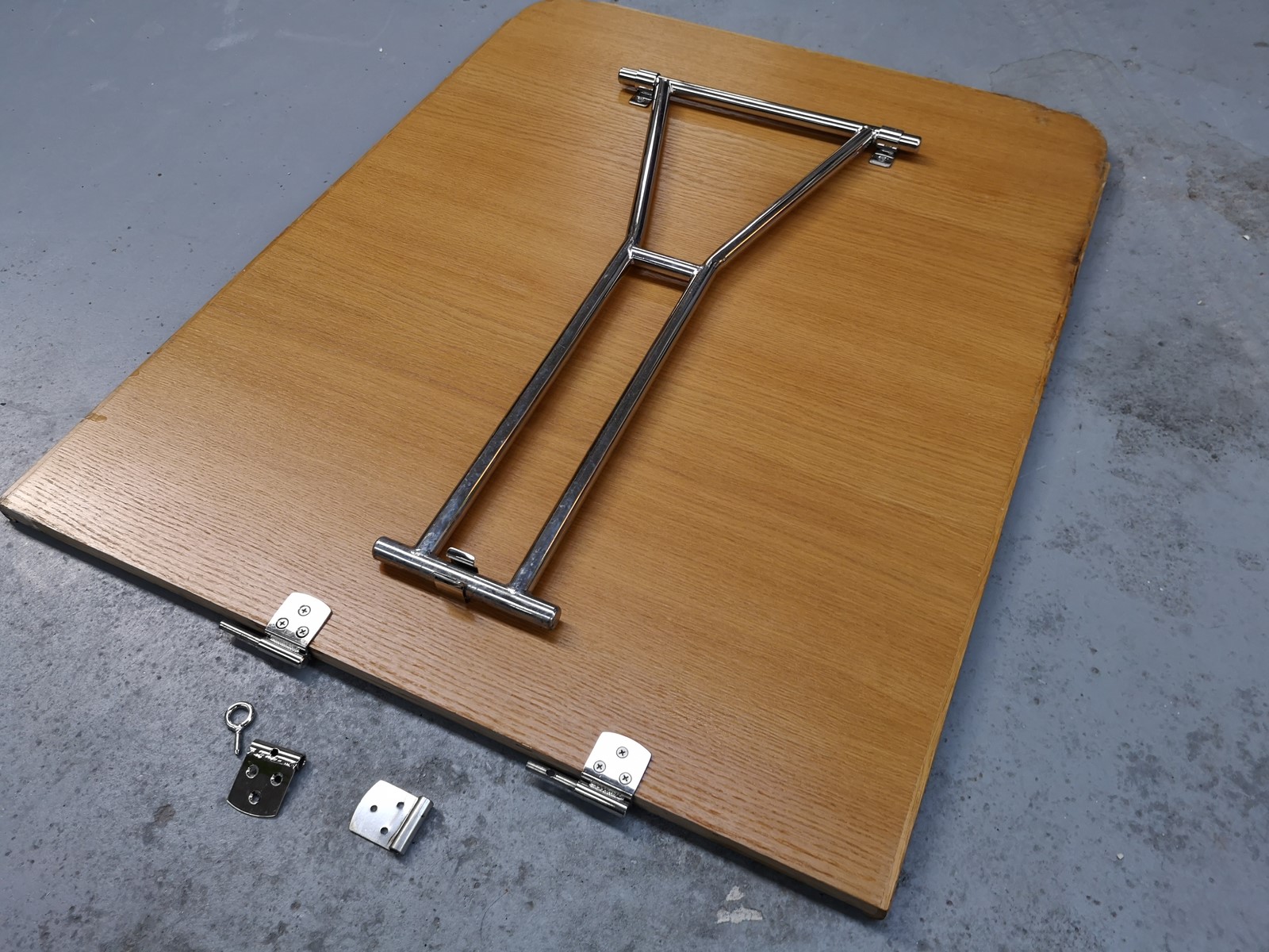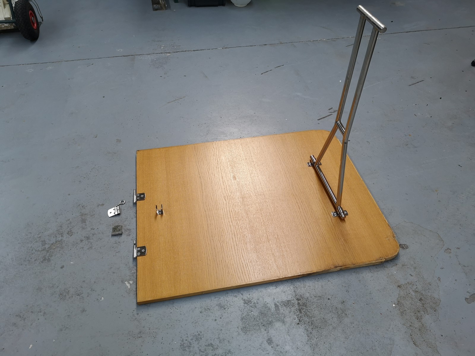 Table en bois avec charniéres et pied inox, dimensions: 780X980mm hauteur du pied 740mm