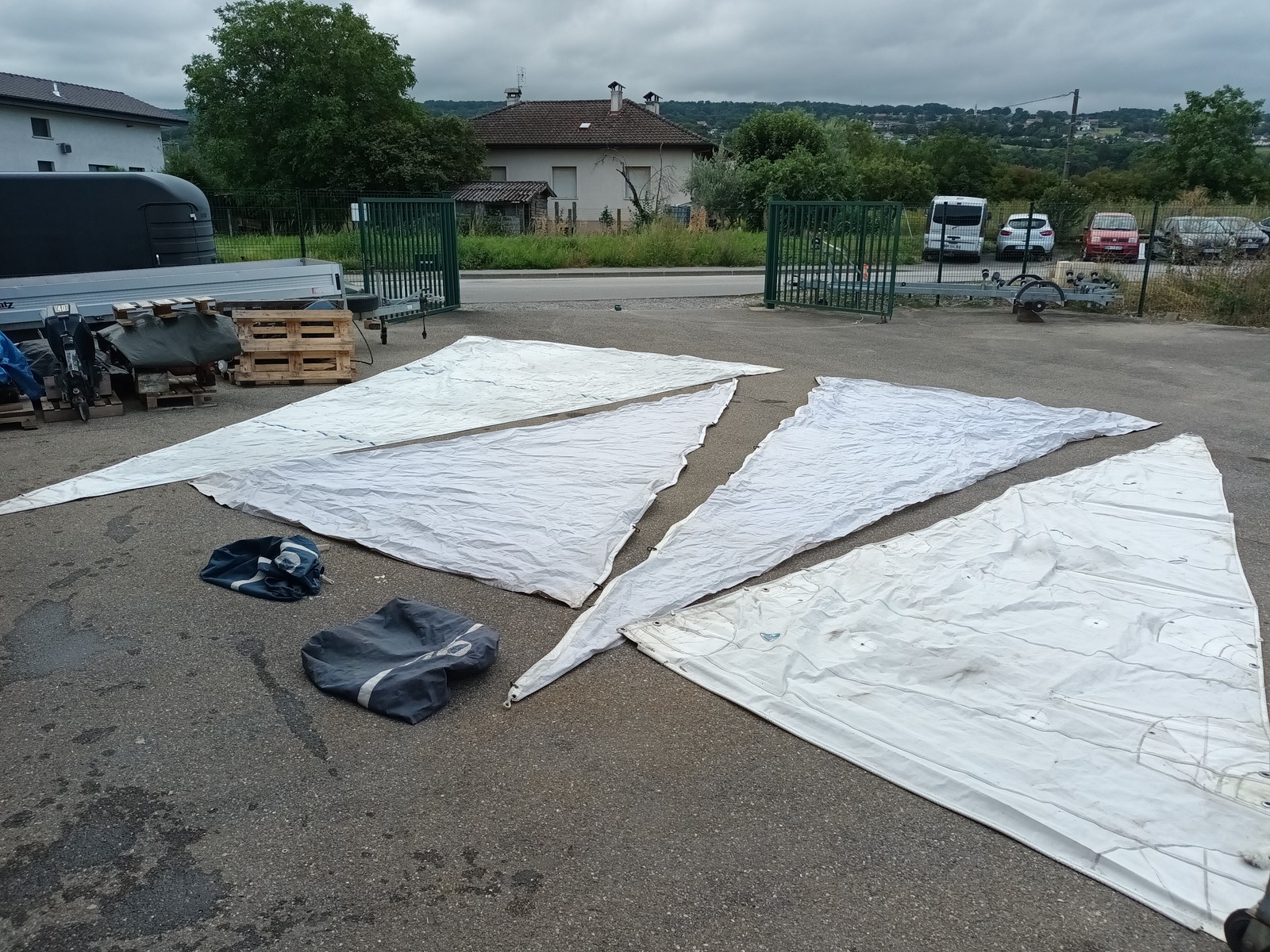 lot voiles pour voilier type ECUME DE MER, ensemble en bon état, réparations a prévoir (voir photos) sur la GV a lattes NORTH SAIL