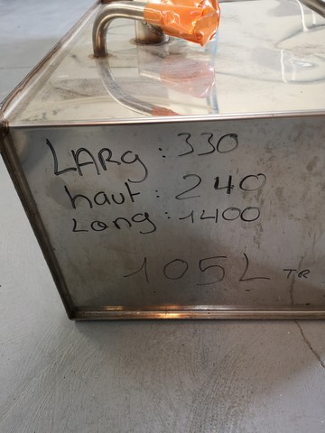 Réservoir inox pour carburant essence ou gasoil.Dimensions:-largeur 330mm-hauteur 240mm-longueur 1400mm-volume 105lt