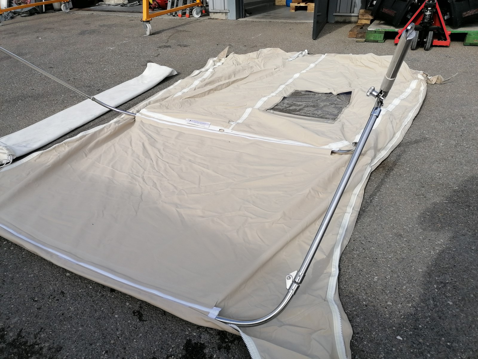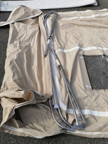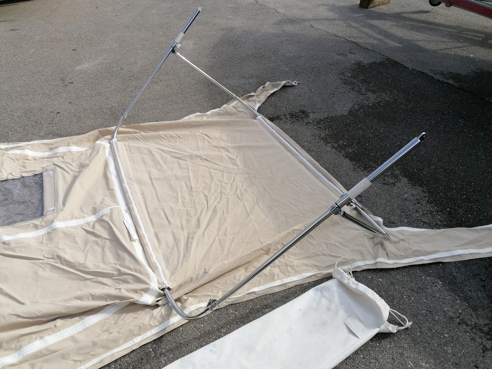taud de camping pour CRANCHI CORALLO 8.40, bimini avec structure inox en état neuf, quelques taches sur les deux rajouts