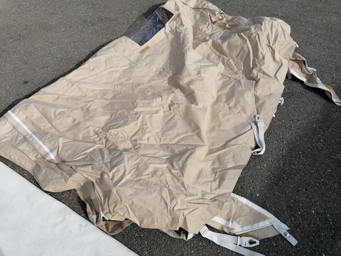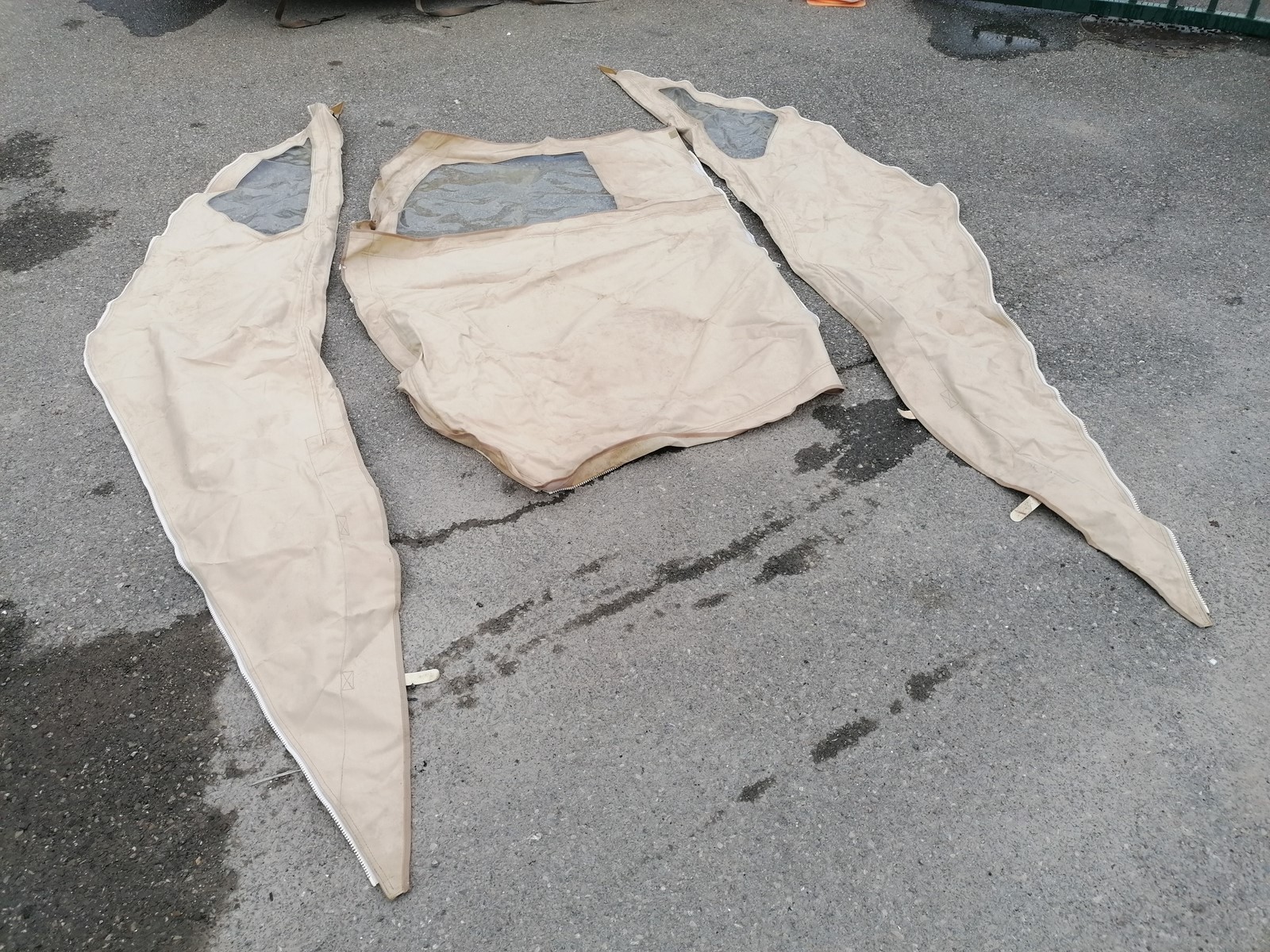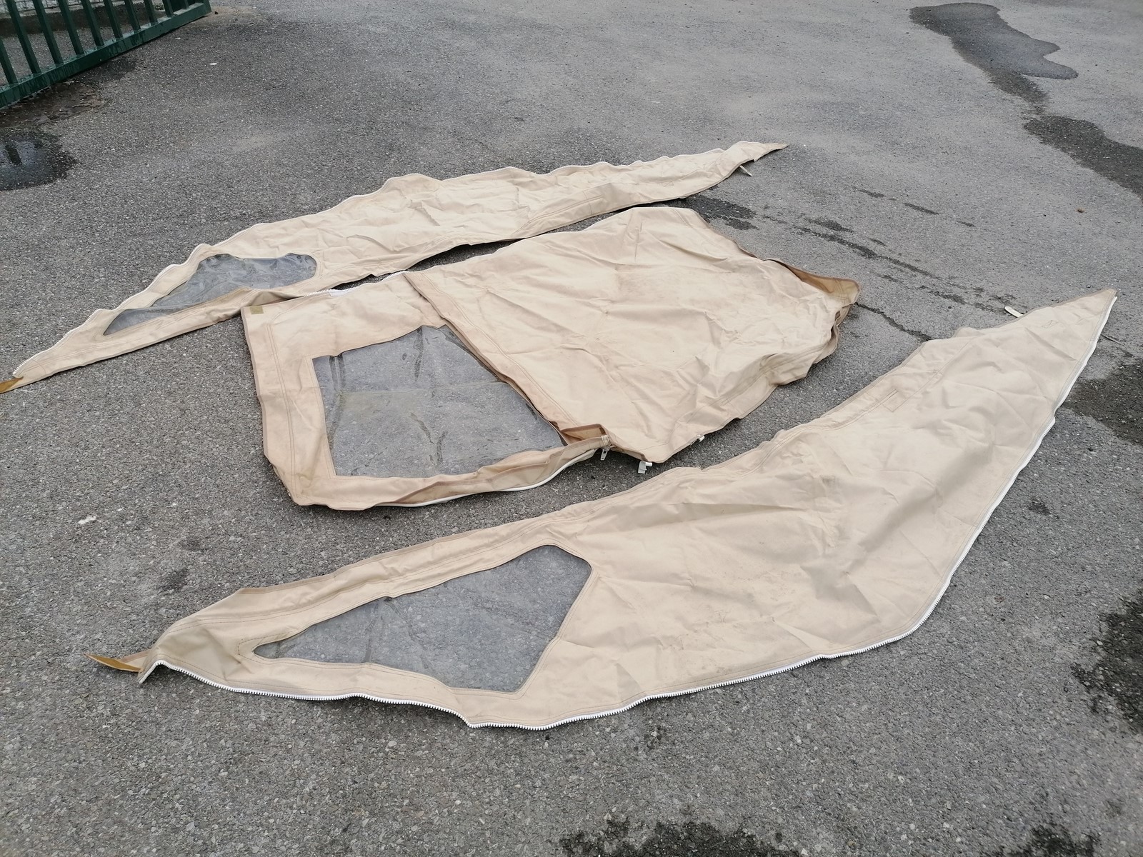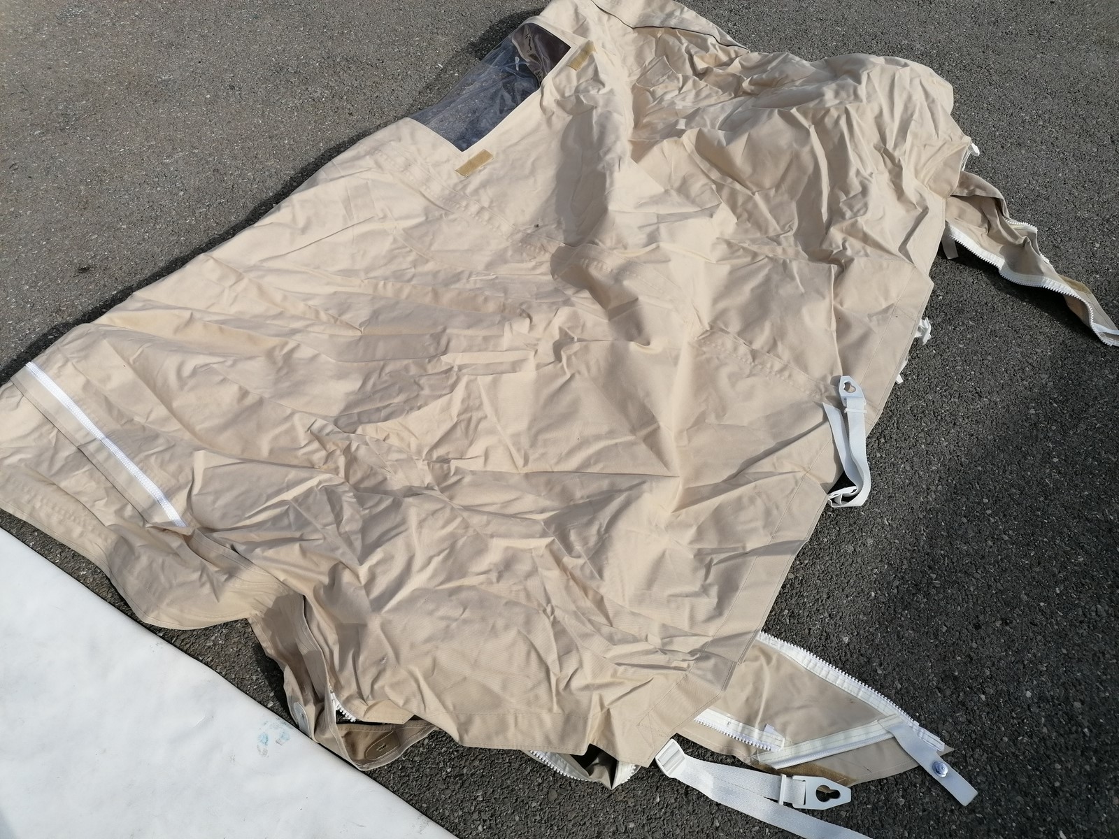 taud de camping pour CRANCHI CORALLO 8.40, bimini avec structure inox en état neuf, quelques taches sur les deux rajouts