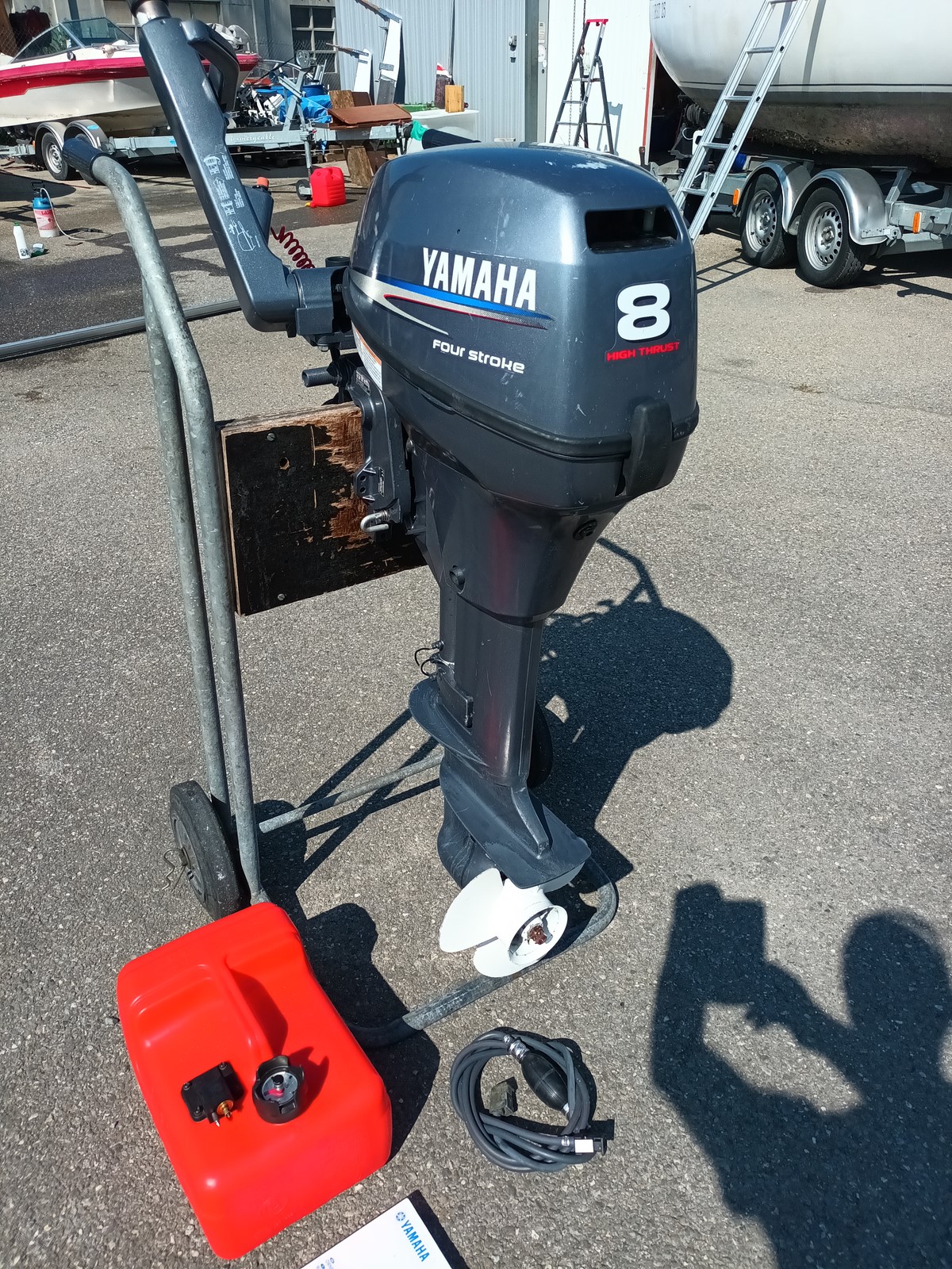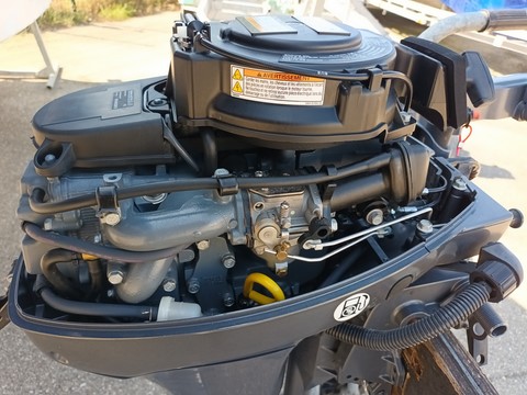 moteur YAMAHA 8cv 4 temps HIGH THRUST, arbre longt, démarrage électrique et manuelle, barre franche, réservoir carburant 12 litres, compréssions moteur ok, n'a jamais connu l'eau salée
